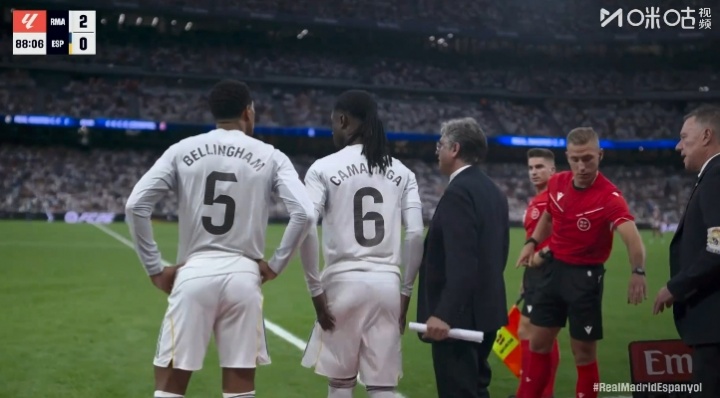 卡马文加上一场为皇马出场是4月24日皇马1-0赫塔费的比赛,贝林厄姆上一场为皇马出场是7月10日皇马0-4巴黎的比赛。