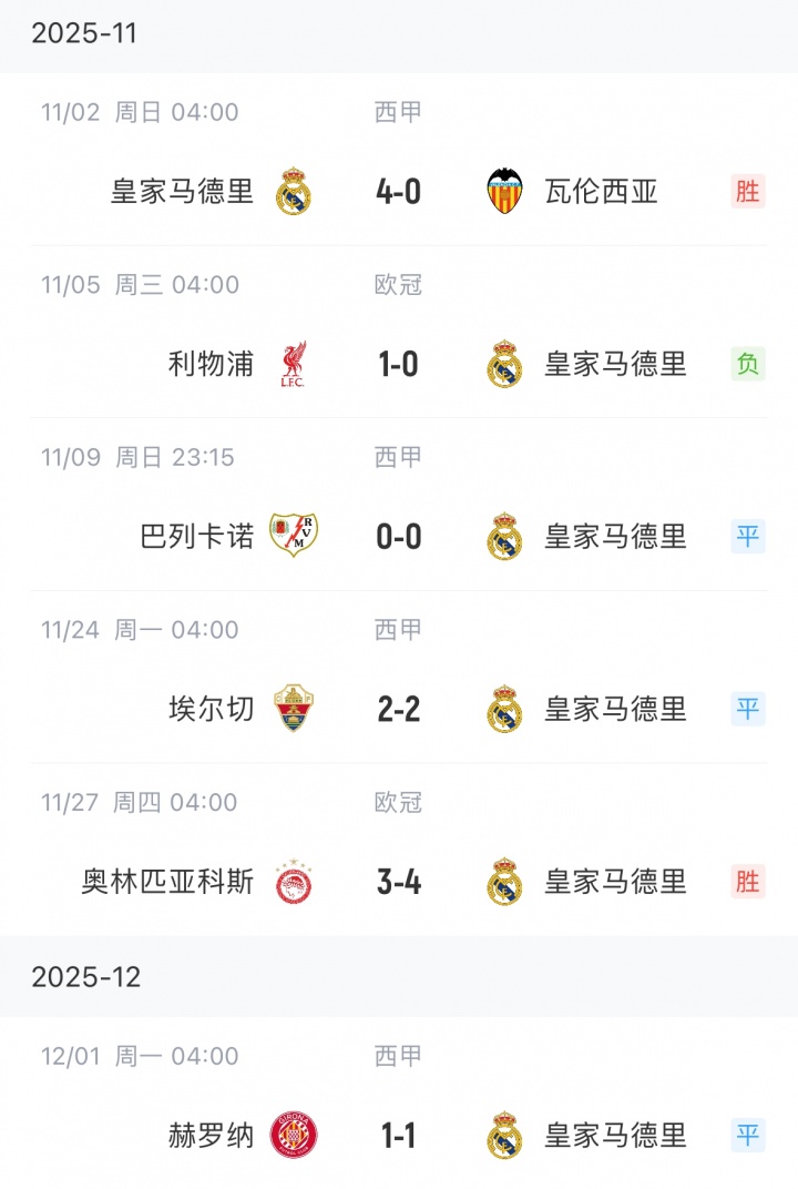 自对阵瓦伦西亚后,皇马5场比赛仅取得1胜↓