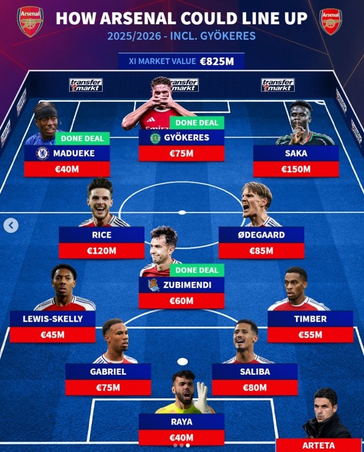 7月27日讯 阿森纳一经官宣签下瑞典中锋约克雷斯,《转会市集》也据此筹画了阿森纳新赛季主力气势,三名新援在列。