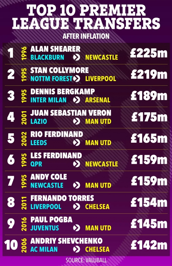 计议通胀后的英超历史TOP10引援: