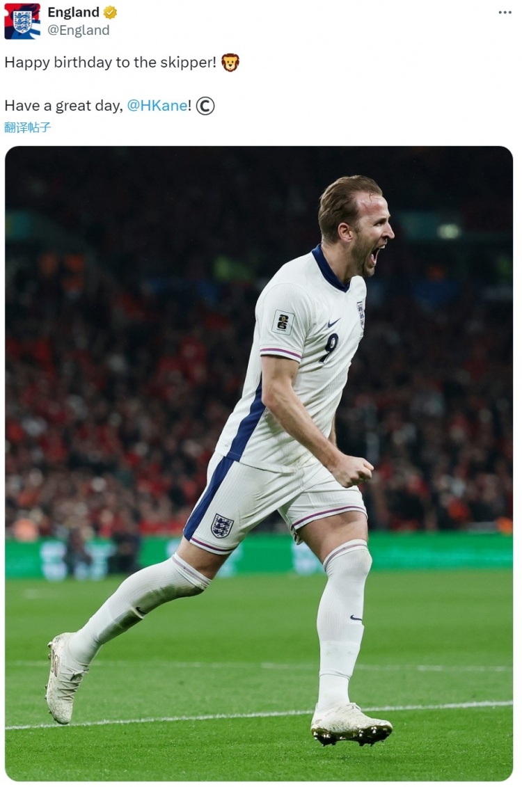 英格兰队官方社媒晒出凯恩的相片,配文:“队长寿辰昌盛,祝你渡过好意思好的一天!”