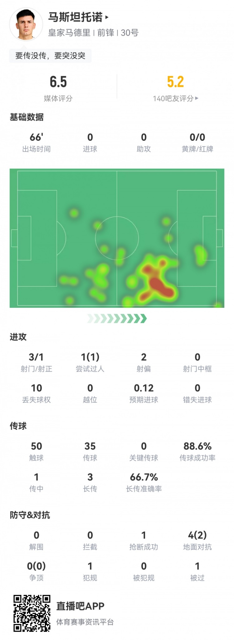 8月31日讯 西甲第三轮,皇马2-1马洛卡。此役马斯坦托诺首发66分钟被换下,球员全场要点数据如下↓
