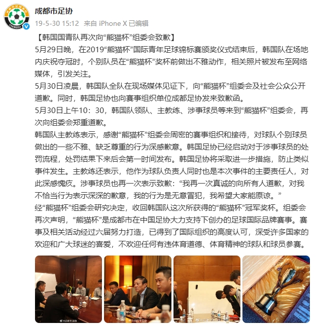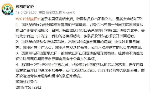 2019年熊猫杯,韩国国青临了一轮3-0投降中国国青,三战全胜夺得冠军。受奖庆典后,韩国球员朴规现脚踩奖杯作念出瞻念当作,联系像片被发布至蚁合媒体,激励平凡海涵。最终,韩国队公开致歉,赛事组委会秘书,收回韩国队获取的熊猫杯冠军奖杯。