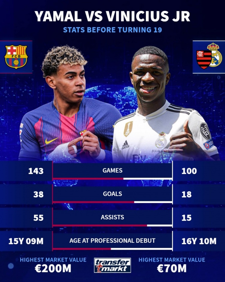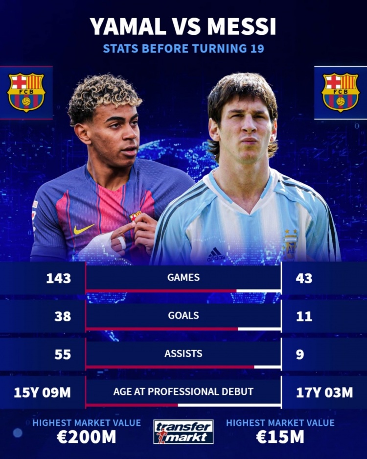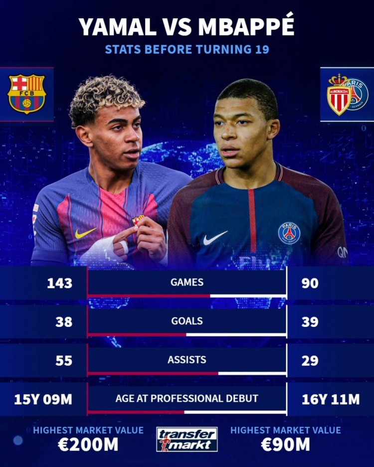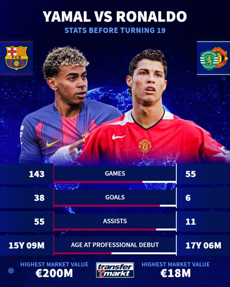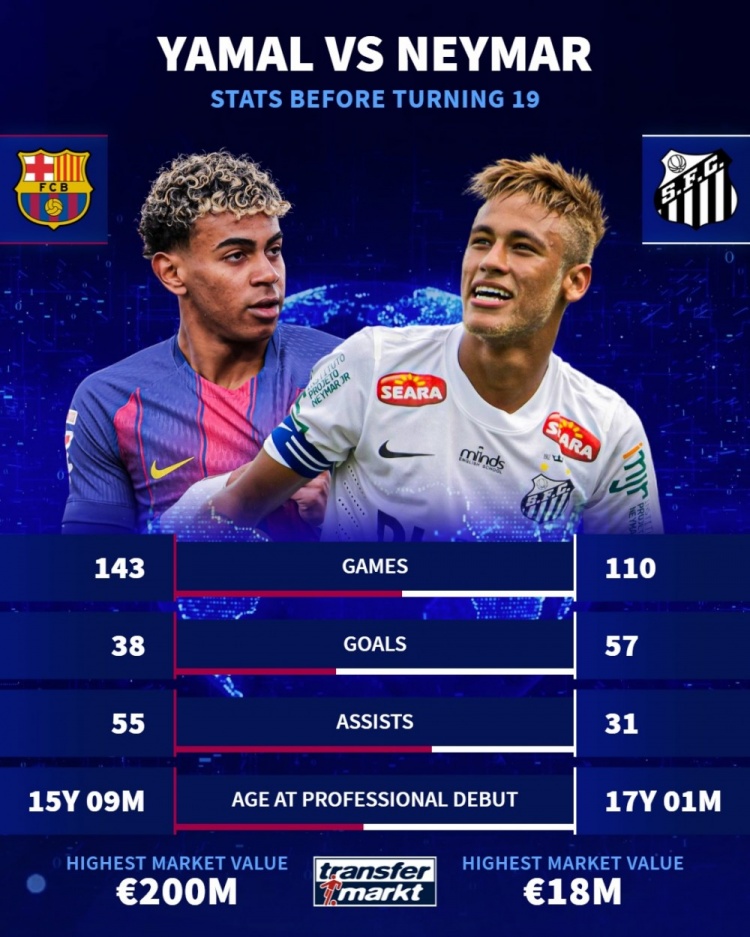 12月3日讯 德国转会阛阓统计了亚马尔、梅西、C罗、内马尔、姆巴佩、维尼修斯19岁之前的数据,并作念出对比。