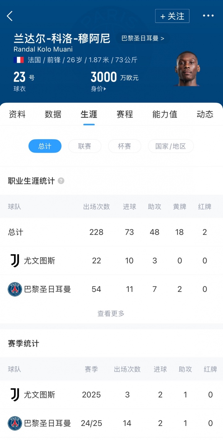 穆阿尼现年26岁,法国先锋。穆阿尼2023年夏窗9500万欧元从法兰克福加盟巴黎,上赛季被巴黎租赁至尤文图斯。服从尤文工夫球员出场22次,孝顺10球3助。现在穆阿尼德回身价为3000万欧元。