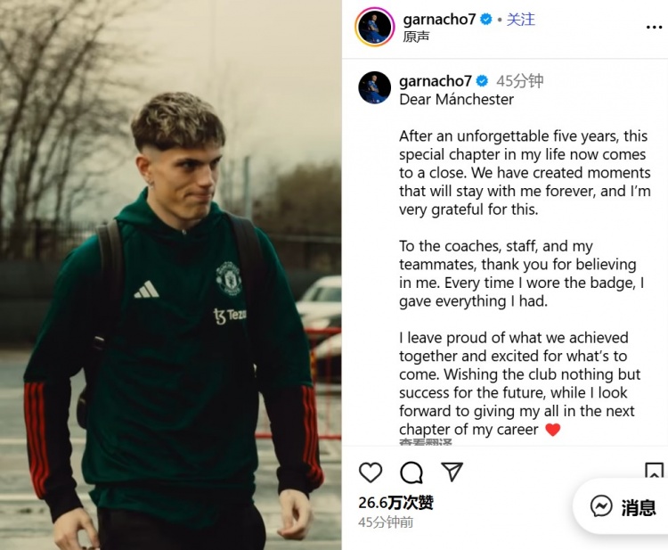 加纳乔写说念:“亲爱的曼联:在这段牢记的五年时光后,我东说念主生中这一段相配的旅程如今画上了句号。咱们一都创造了很多将耐久留在我心中的时分,我对此深怀谢忱。”