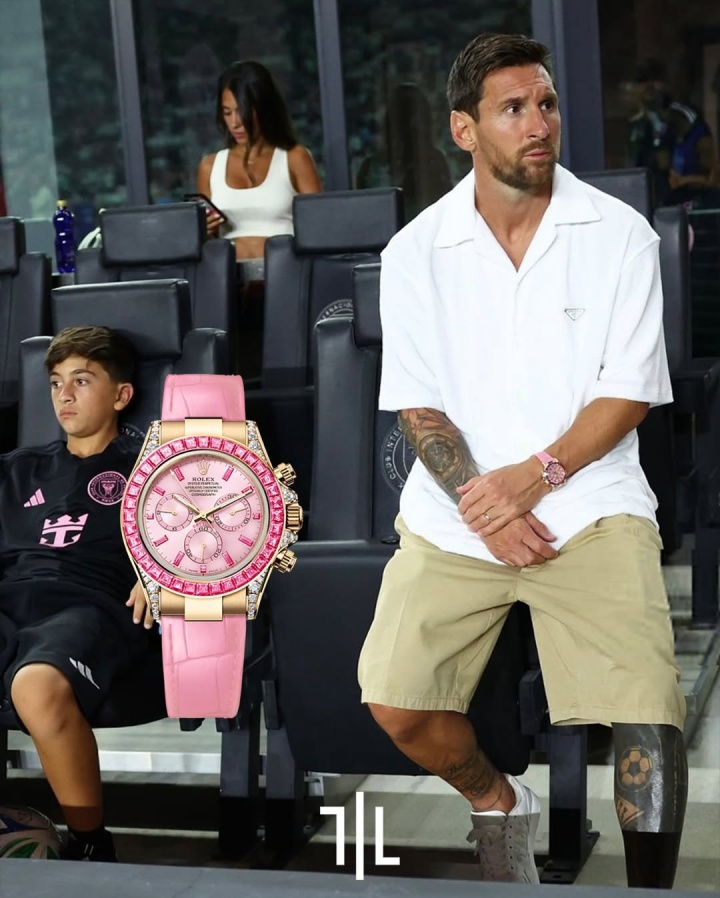 梅西本场停赛缺席,他来到了现场不雅战比赛。据特意报谈群众明星腕表的账号INSANE LUXURY先容,梅西佩带的是劳力士一款帮忙的腕表,这款表为18K黄金材质,嵌入坚持并配有粉色表盘。交融了高档珠宝和Daytona的蓄意元素。是劳力士迄今范围最帮忙且最具活力的坚持嵌入阵势之一。