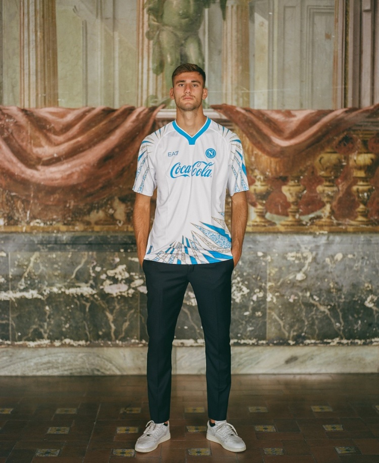 打算亮点是球衣上的地砖几何图案:这一打算理念相称致意了坎帕尼亚地区的波旁王室居所:波蒂奇皇宫,打算联接了历史的优雅和指挥的当代感,酿成了前锋与足球的特有联接。并以金色点缀,唤起了皇家居所的守密立场。流通且当代的打算线条从头诠释了壁画和马赛克的丽都。
