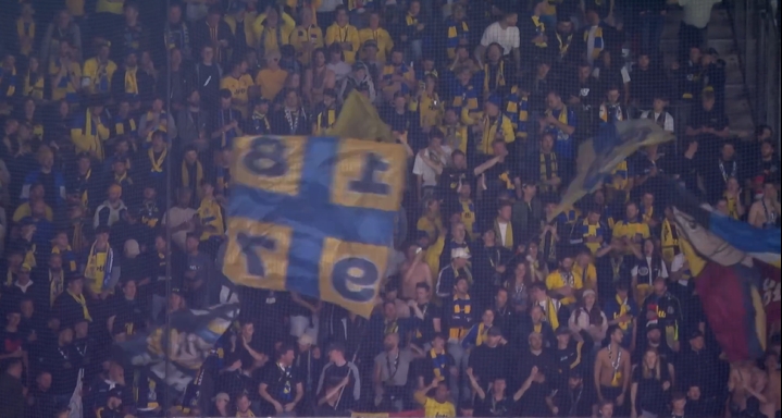 全场比赛罢休后,圣吉罗斯的球员们和远征客场的球迷荒诞庆祝,为球队的欧冠开门红庆贺。