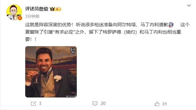詹俊:这即是声势深度的上风!传奇好多枪迷准备向阿尔特塔、马丁内利说念歉。这个夏窗除了引援“来者不拒”除外,留住了特罗萨德(续约)和马丁内利也额外紧迫!!