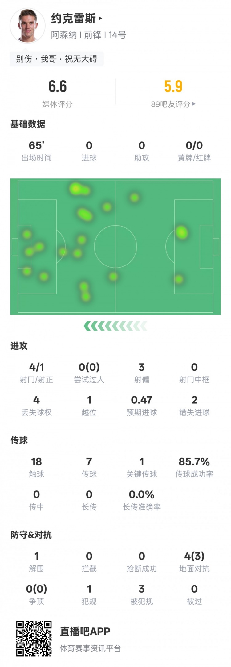 9月17日讯 欧冠联赛阶段第1轮,阿森纳客战毕尔巴鄂竞技,约克雷斯首发出战,4次射门1次射正,送出1次要道传球,2次错失进球契机,评分6.6。