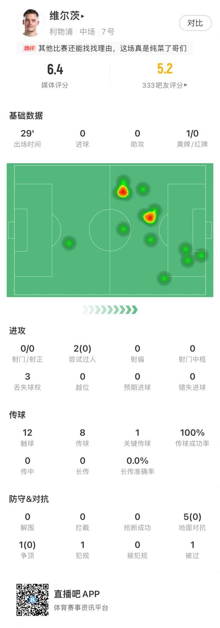 维尔茨今夏以1.36亿欧总价加盟利物浦,加盟于今首发出战7场,但仅孝敬1次助攻,还未成绩我方赤军生计的首粒进球。