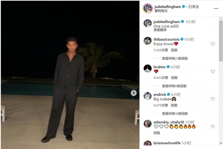 贝林厄姆上个月摄取肩部手术,当今仍在度假+养伤,他在外交媒体上晒出多张度假相片。库尔图瓦、迪亚斯、恩德里克等队友留言点赞。