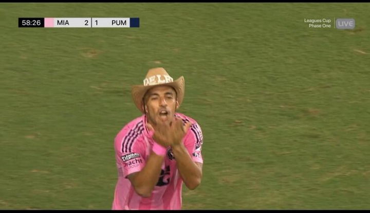 第48分钟,苏亚雷斯接德保罗直塞抽射破门,进球后他轻易庆祝,到场边提起凉帽COS牛仔,但随后进球被吹越位。