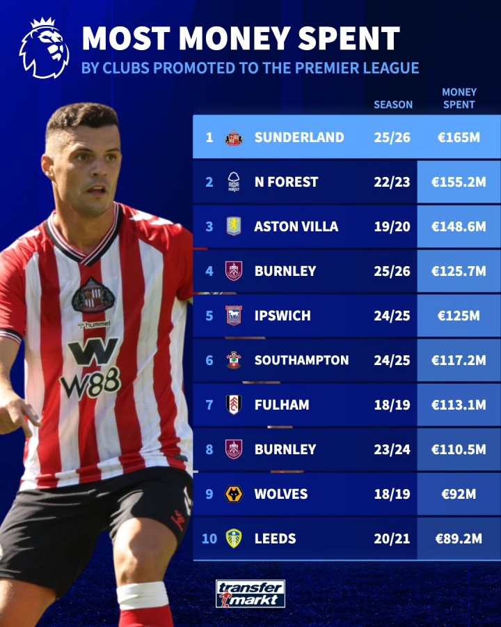 1.桑德兰 25-26 1.65亿欧