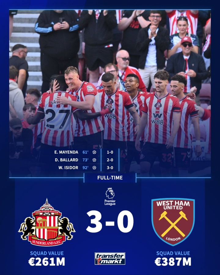 08月18日讯 英超第1轮,“黑猫”桑德兰3-0打败西汉姆,取赢得归英超首胜。德转官方晒出数据,桑德兰今夏破耗1.65亿欧,成为历史上破耗最多的英超升班马。