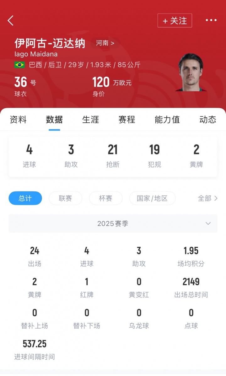 迈达纳现年29岁,巴西后卫,身高1米93。迈达纳客岁2月摆脱身加盟河南,本赛季代表球队出场24次,孝敬4球3助。当今他德回身价为120万欧元。