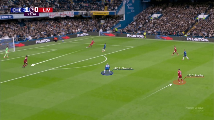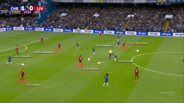 不外切尔西一役也诠释斯洛特并非不会变通:把索博斯洛伊挪到右后卫,换上琼斯和维尔茨这两个“跑不死”,立马打出精妙合营——琼斯解脱恩佐接赫拉芬贝赫传球,维尔茨和索博斯洛伊的站位牵制住库库雷利亚与凯塞多,为琼斯直塞萨拉赫创造了内切传中的空间: