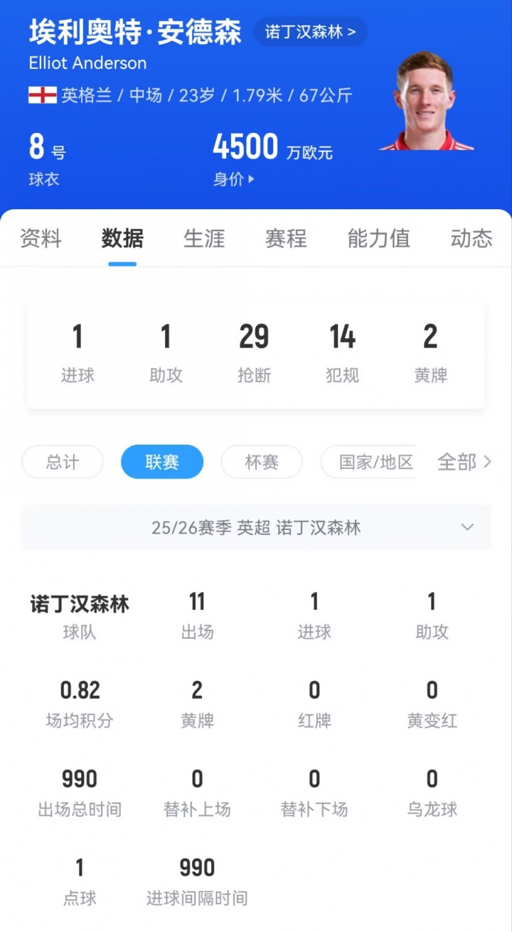 23岁的丛林中场埃利奥特·安德森本赛季为丛林在联赛已出场11次,孝敬1球1助攻。现在他的德回身价为4500万欧元。