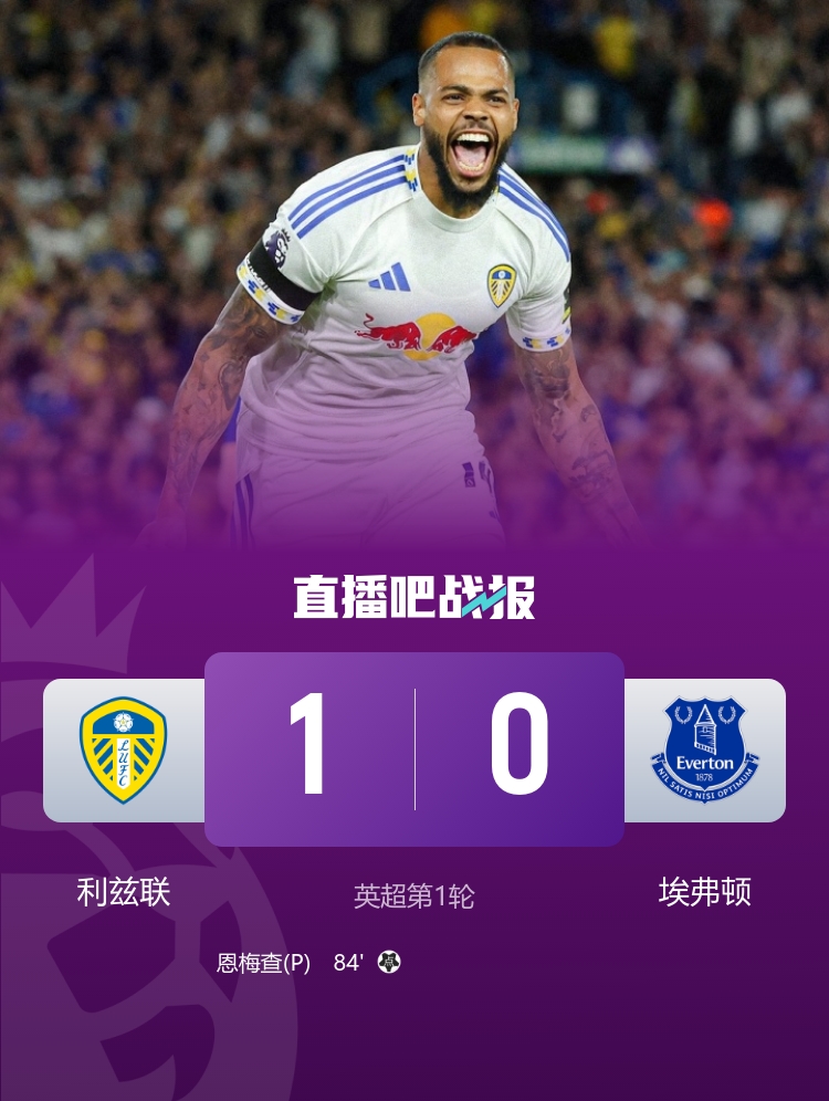 英超第1轮,利兹联在埃兰路球场1-0慑服埃弗顿,利兹联时尚恩梅查在84分钟打进制胜点球。