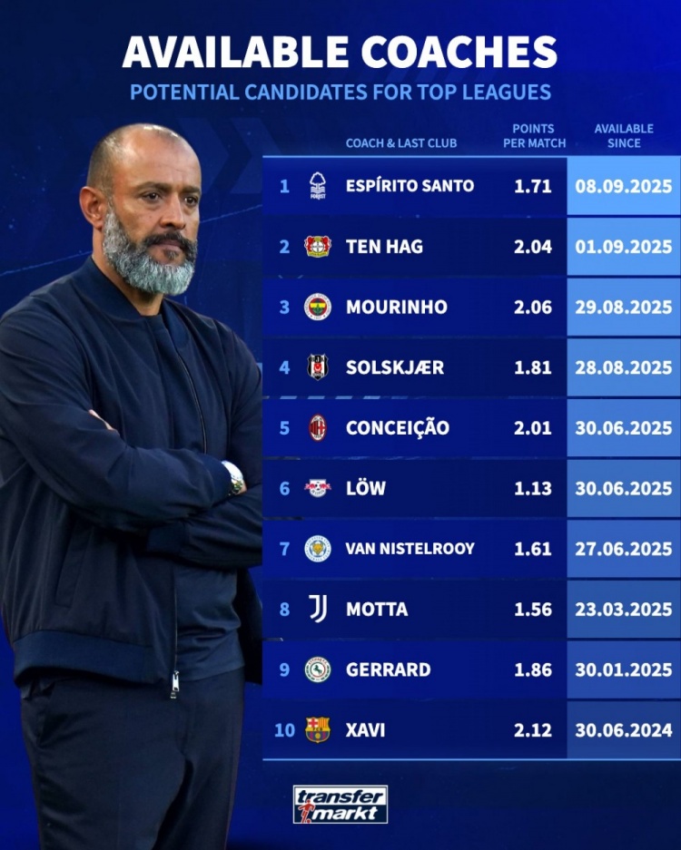 9月10日讯 德国转会商场清点了现在失业的熏陶,穆里尼奥、滕哈赫、哈维、努诺在列。
