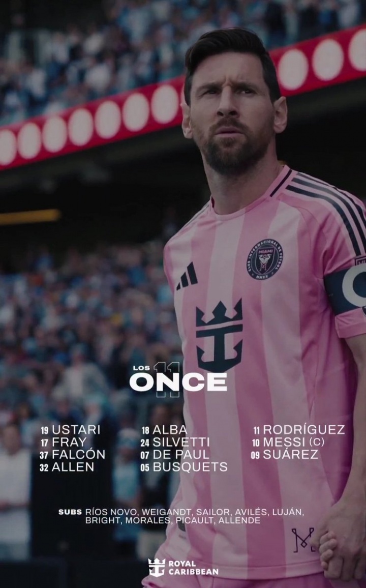 迈阿密海外首发:19-乌斯塔里、18-阿尔巴、17-弗雷、37-法尔肯、32-阿伦、24-马特奥·西尔维蒂、7-德-保罗、5-布斯克茨、11-B·罗德里格斯、10-梅西、9-苏亚雷斯