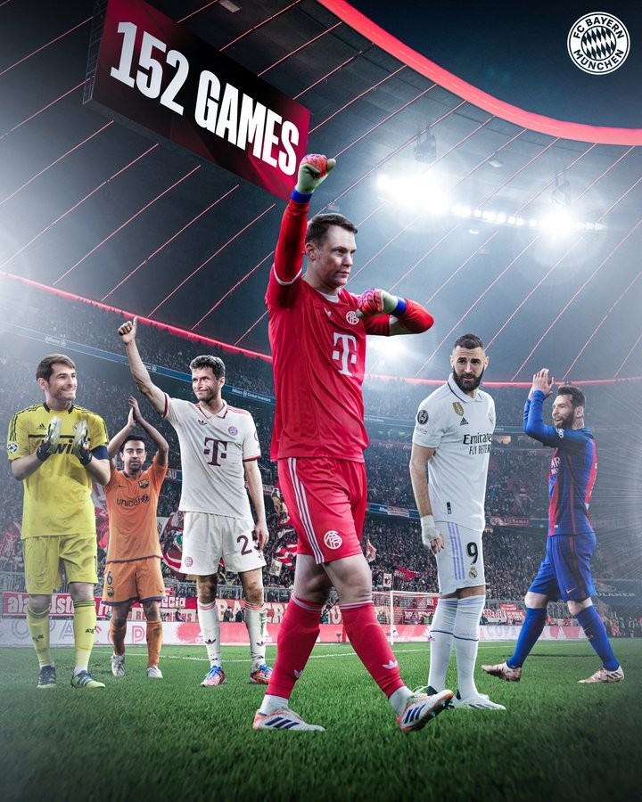拜仁官推写谈:“诺伊尔依然进入152场欧冠,历史名依次六!”