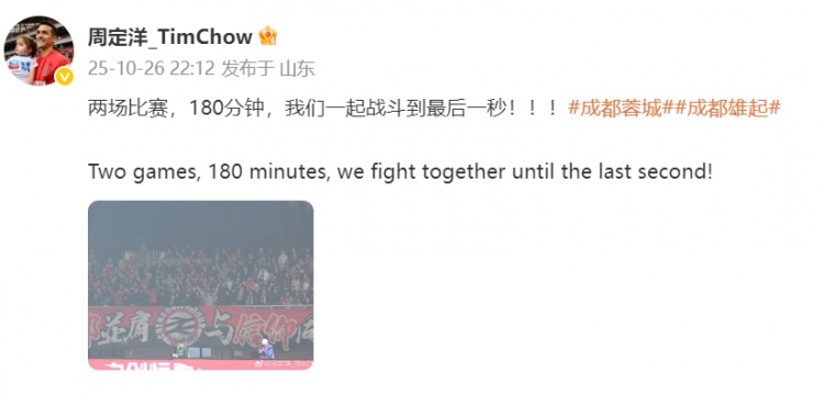 赛后,蓉城球员周定洋在个东说念主微博中写说念:两场比赛,180分钟,咱们一都斗争到临了一秒!!!