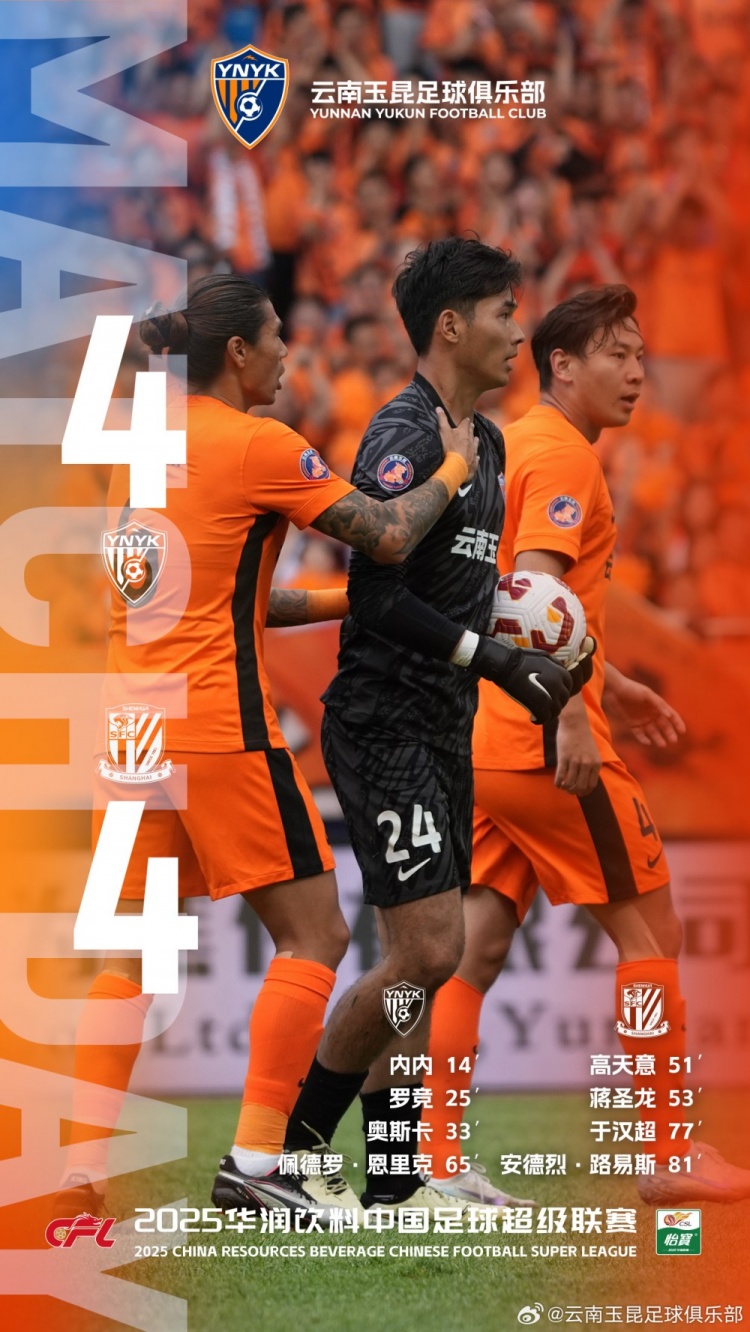 全军用命,荡人心腑!2025中超联赛第19轮,主场作战的云南玉昆最终与“领头羊”上海申花战成4比4平。开场后,云南玉昆得回了虚幻开局,第14、25、33分钟,内内、罗竞与奥斯卡先后破门,得回了3比0的教育上风。上半场截止前,高天意径直狂妄球破门扳回一城。