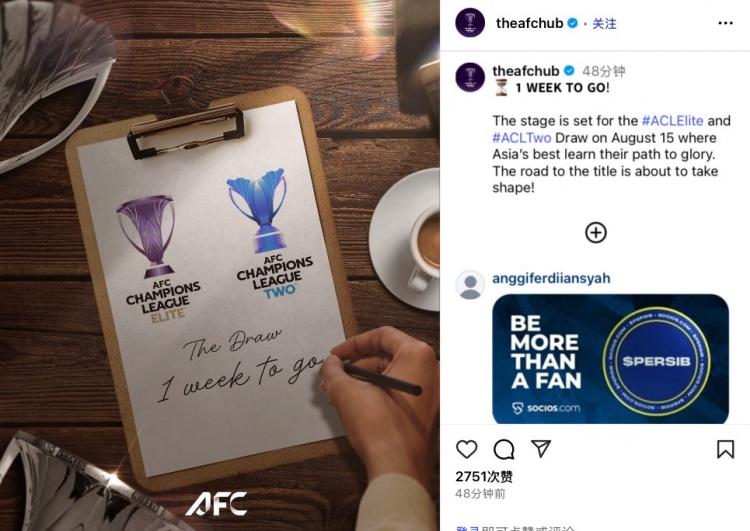 亚足联官媒配文写谈:“距离抽签典礼还有一周!亚冠精英联赛和二级联赛抽签将在8月15日举行,舞台一经准备好了,通往冠军之路行将成行!”