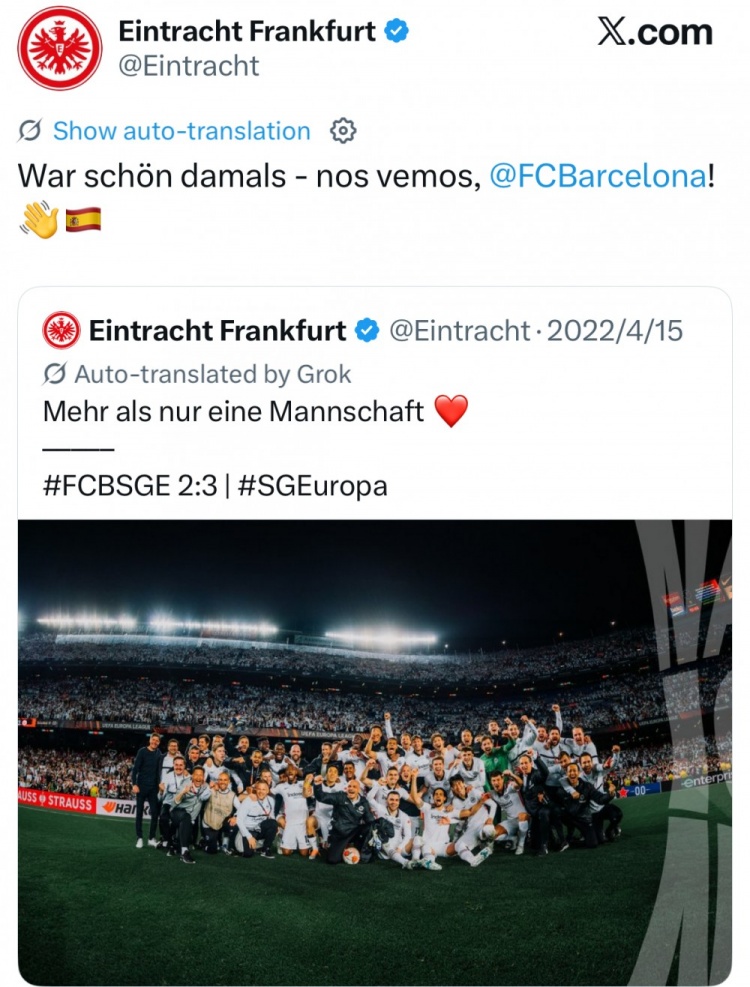在抽签出炉后,法兰克福官推转发了22年4月,球队在欧联杯1/4决赛次回合客场3-2打败巴萨晋级下一轮的赛后球队合影庆祝凯旋的社媒,并配文写谈:“那是一段深邃的履历,期待咱们的再次相见,巴萨!”