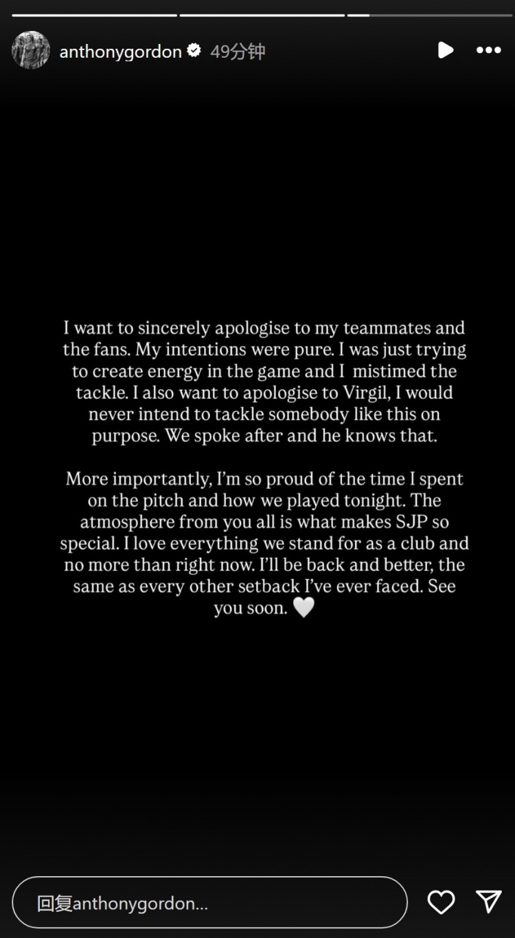 戈登赛后在酬酢媒体上写谈:“我思要赤诚地向我的队友和球迷们谈歉。我的意图很单纯,我仅仅思在比赛中引发一些活力,但此次铲球时机把合手得不好。我也要向范迪克谈歉,我毫不会有利这么铲东谈主。咱们之后聊过,他知谈这小数。